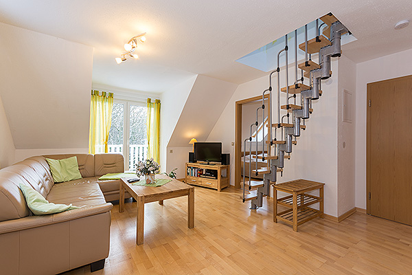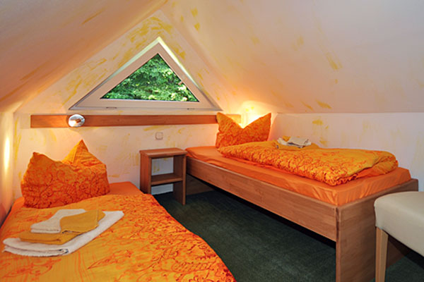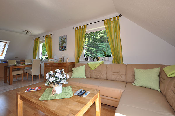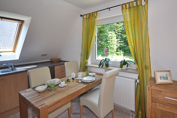 Unsere linke 2-Raum-Wohnung zur Waldseite ist über den Haupteingang zu erreichen und befindet sich im Dachgeschoss unseres Hauses. Sie ist liebevoll mit hochwertigen Vollholz-Eichenmöbeln und Parkettfußboden eingerichtet.