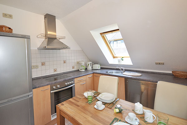 Im gefliesten Küchenbereich erwartet Sie eine moderne Einbauküche mit Geschirrspüler, 4-Ceranplatten-Einbauherd mit Backofen sowie eine geräumige Tiefkühlkombination. Kaffeemaschine, Wasserkocher und Toaster gehören genauso zur Ausstattung wie Geschirr und Kochtöpfe. Ein gemütlicher Essplatz mit Blick in den Wald lässt das kleine Frühstück sicher etwas ausgiebiger ausfallen.